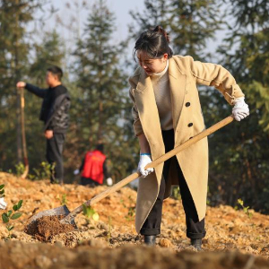2月18日,大学生在贵州省铜仁市玉屏侗族自治县平溪街道舞阳社区种植油茶苗。