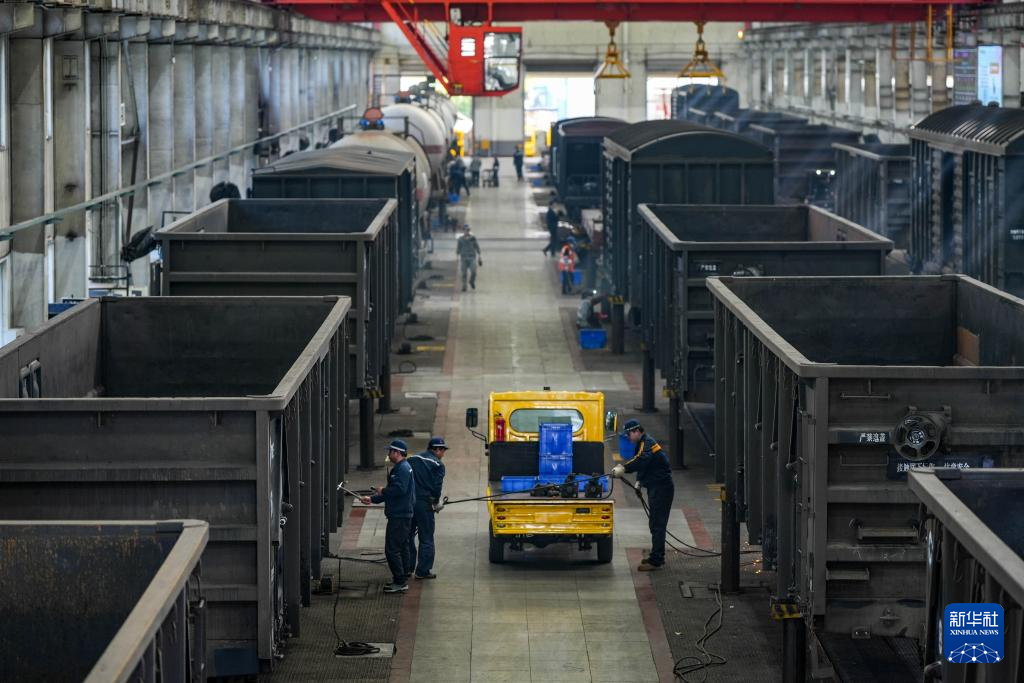 2月18日,在贵阳南车辆段检修车间,工作人员对货运列车车体进行检修。