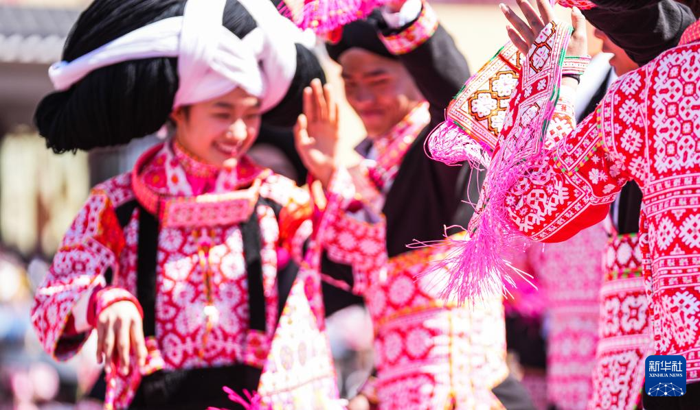 2月19日,苗族群众在六枝特区梭戛苗族彝族回族乡高兴村跳花场表演舞蹈。