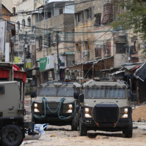 这是2月18日在约旦河西岸城市图勒凯尔姆拍摄的以色列军车。