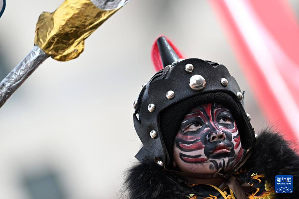 2月19日,在青海省西宁市,小演员在社火巡游活动中表演。