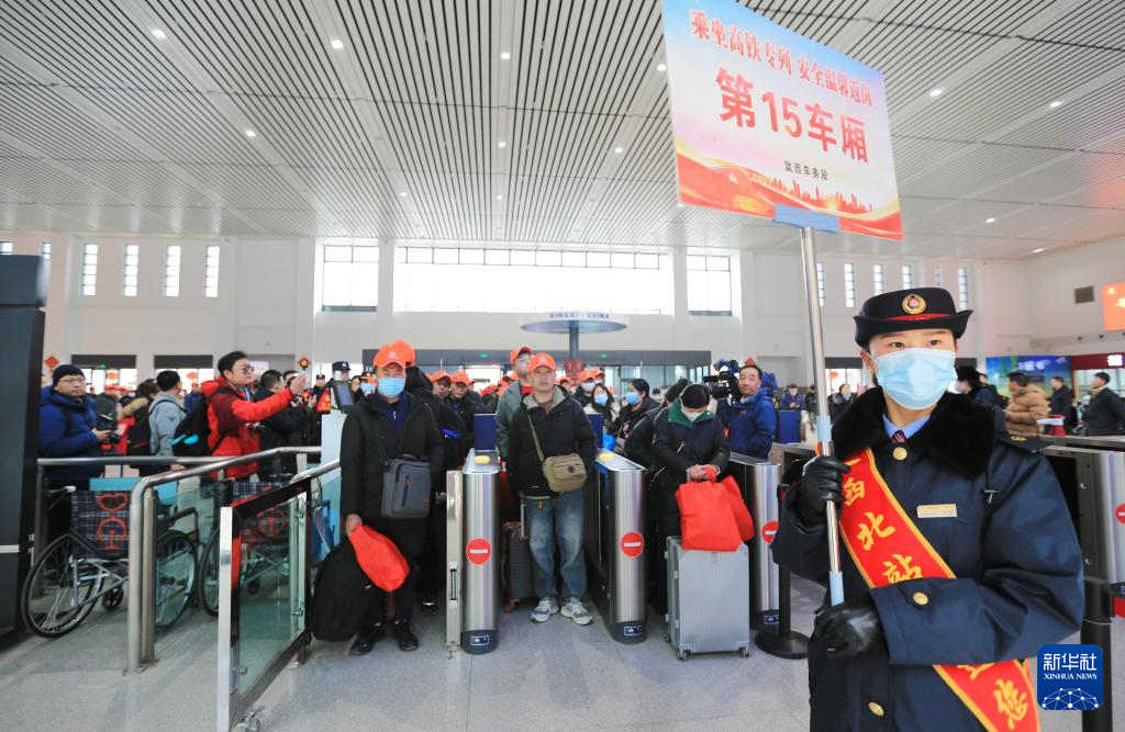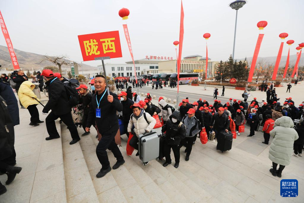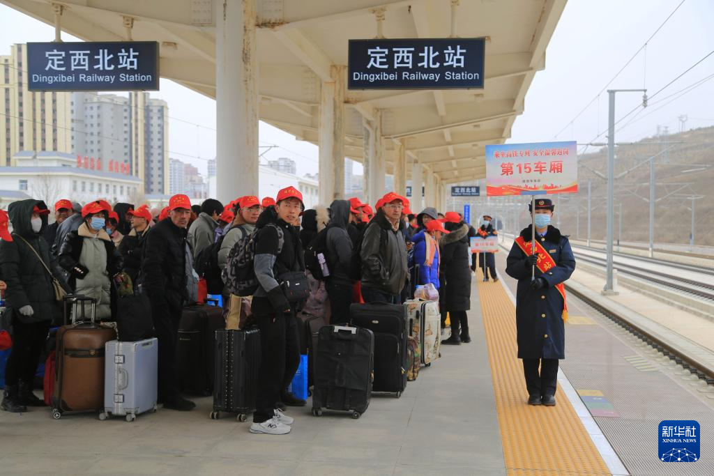 2月19日,甘肃省定西市在宝兰高铁甘肃定西北站站前广场举行返岗务工人员出发仪式。