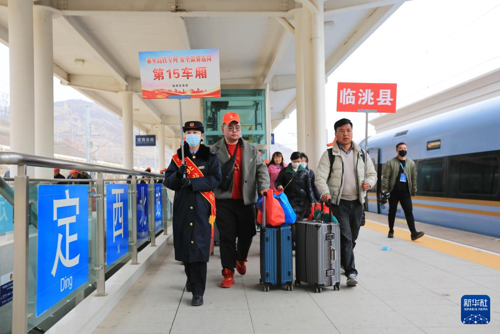 2月19日,宝兰高铁甘肃定西北站工作人员引导返岗务工人员乘车。