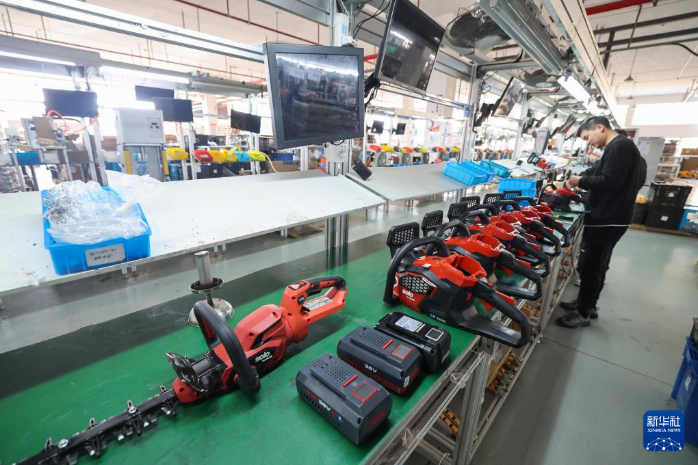 2月19日,工人在浙江省金华市金义新区的浙江白马科技有限公司的车间检测电锯。该公司是园林设备制造商,产品以出口为主。