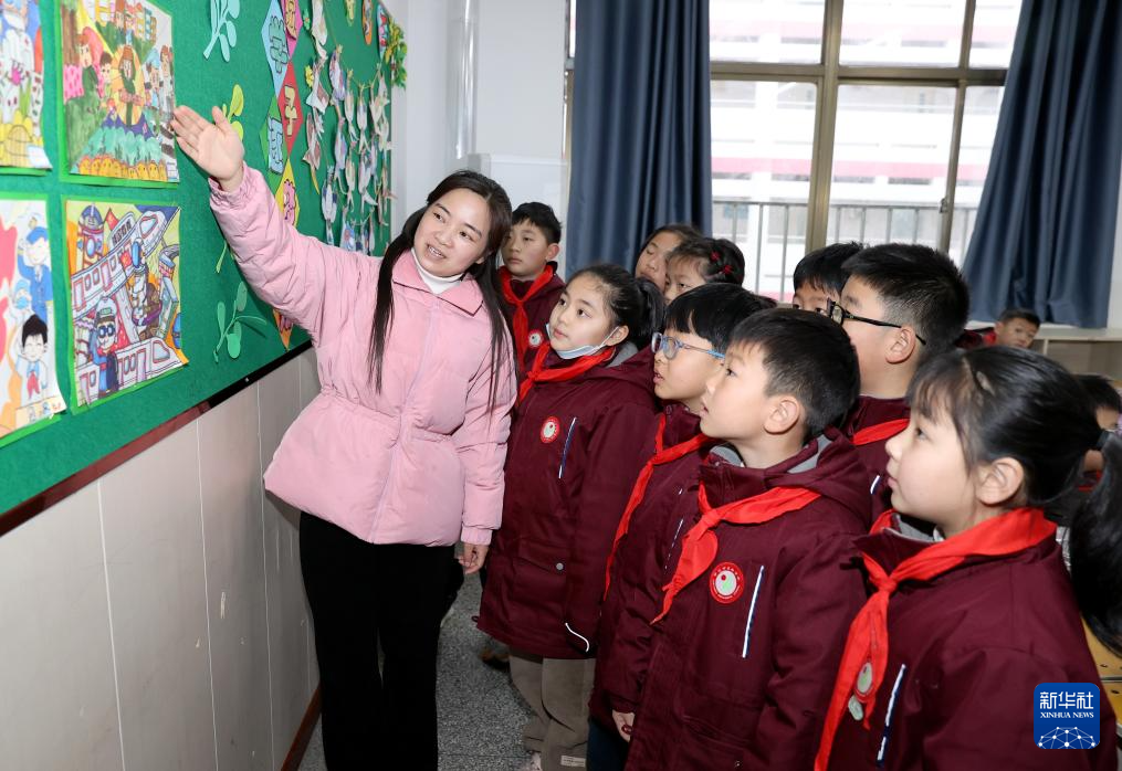 2月20日,江苏省宿迁市实验学校的老师在点评学生制作的画报。