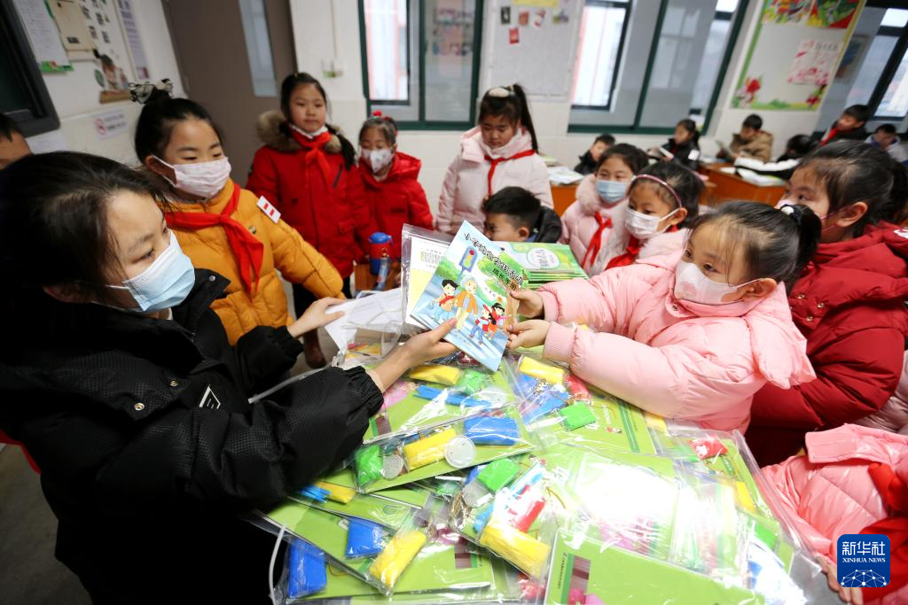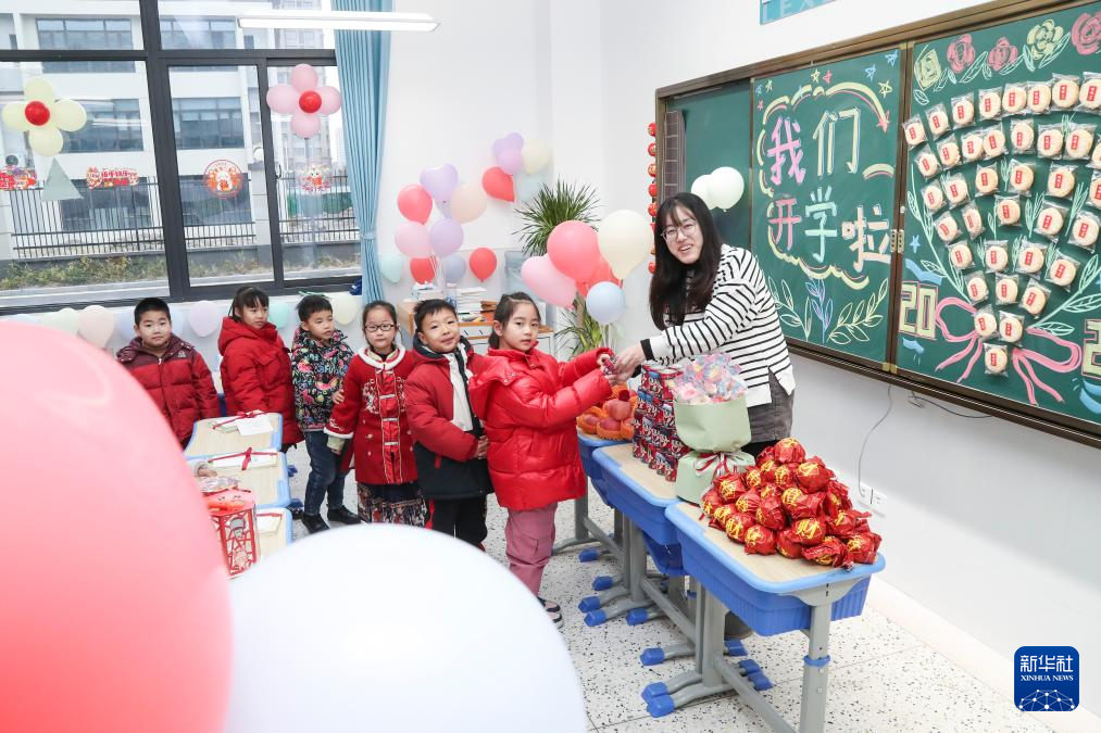 2月20日,在江苏省徐州市云飞小学,老师给同学们送上新学期的礼物,寓意着“平安成才”。