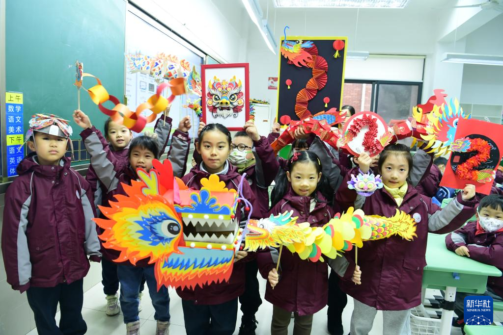 2月20日,江苏省太仓市科教新城实验小学的学生展示龙年春节期间用易拉罐、一次性纸杯、废弃塑料袋“变废为宝”制作的生肖龙题材的民俗手工艺品。