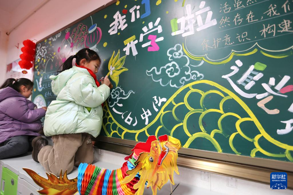 2月20日,学生在江苏省连云港市院前小学二年级的教室里准备开学第一课板报。