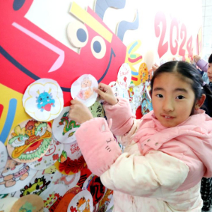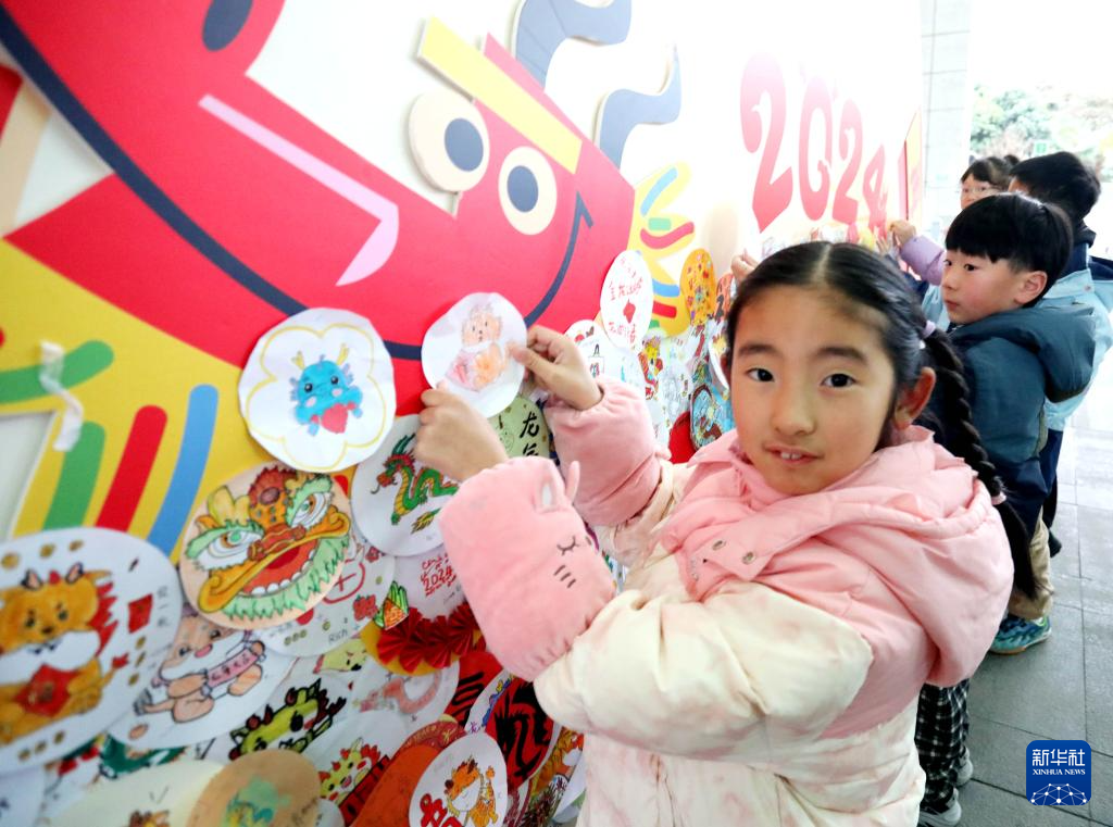 2月20日,在江苏省苏州市金阊实验小学校,小学生在“龙年幸福墙”上贴上自制的心愿卡。