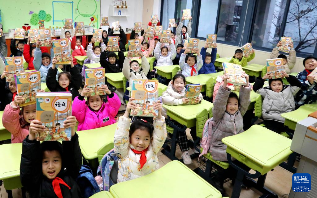2月20日,在江苏省苏州市金阊实验小学校,小学生展示领到的新学期课本。