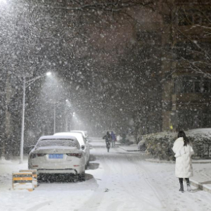 2月20日,在北京市大兴区郁花园二里小区,居民在雪中回家。