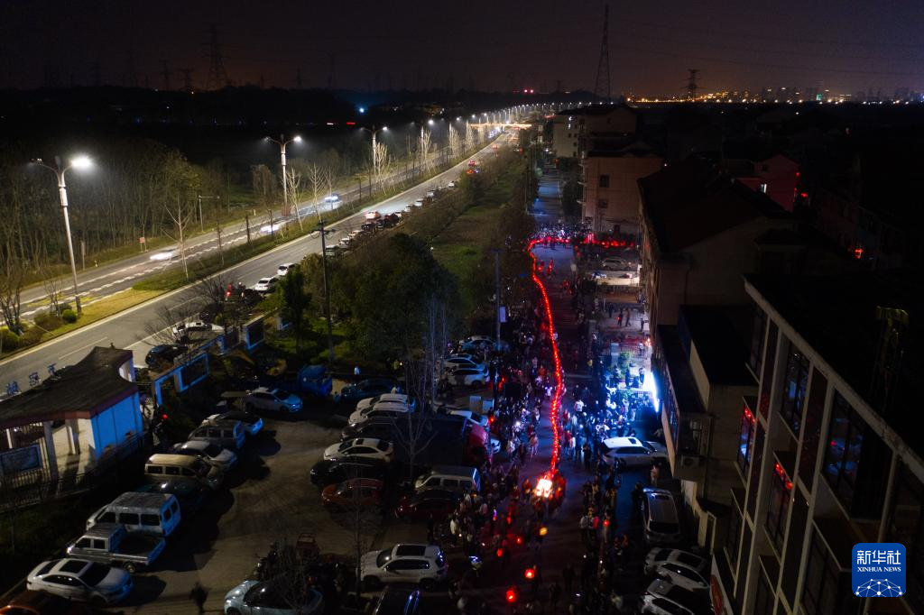 2月19日,在澧浦镇下宅村,村民们抬着100多节长的传统板凳龙在村落中穿行(无人机照片)。
