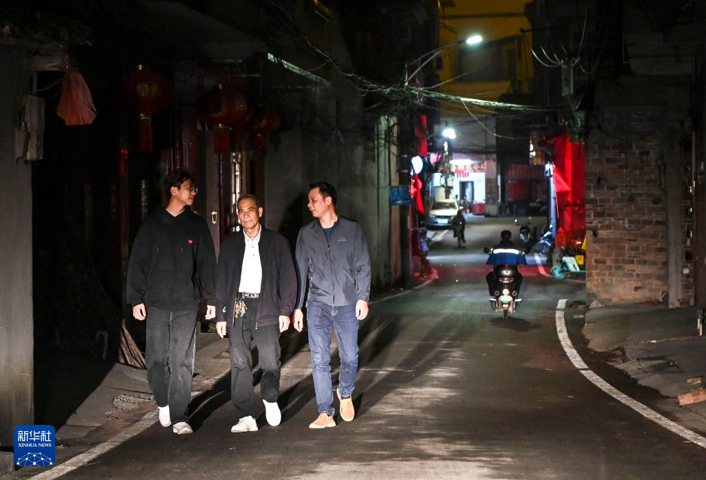 2月20日,在广西兴业县石南镇环江村,梁柱明(右一)和儿子梁德和(右三)与村民交流。