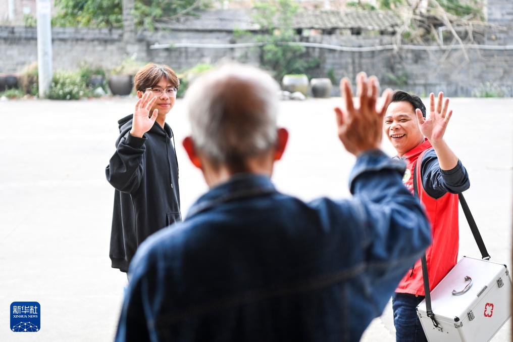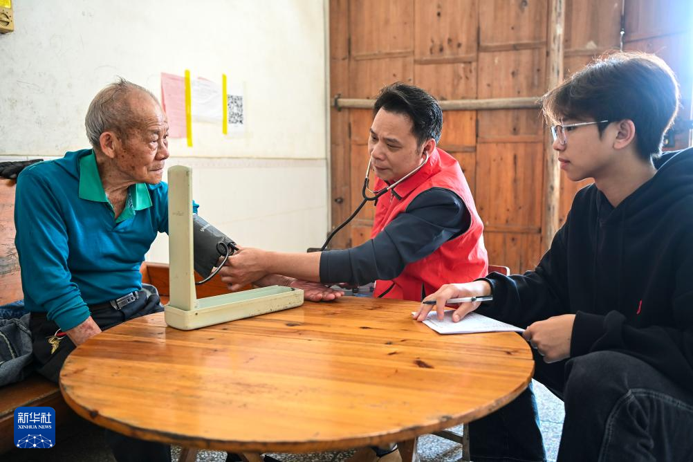 2月21日,在广西兴业县石南镇环江村,梁德和(中)带着儿子梁思为一起入户为老人测量血压。