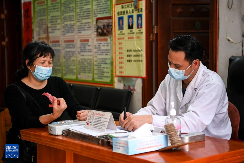 2月20日,在广西兴业县石南镇环江村卫生室,梁德和(右)为村民看病。