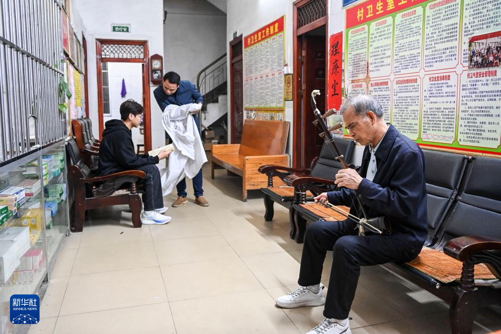 2月20日,在广西兴业县石南镇环江村卫生室,结束了一天的工作的梁柱明(右)拉起二胡,梁德和与儿子在一旁聊天。