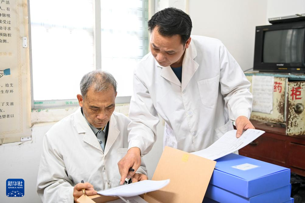 2月20日,在广西兴业县石南镇环江村卫生室,梁柱明(左)与儿子梁德和一起完善村民的健康档案。