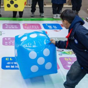 2月21日,在江苏省泰州市姜堰区实验小学教育集团北街北校区,泰州市姜堰区人民检察院未成年人法治宣讲团的工作人员和学生一起玩“法治飞行棋”游戏。