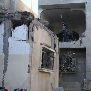 2月21日,在加沙地带南部城市拉法,巴勒斯坦人查看以军空袭后的废墟。