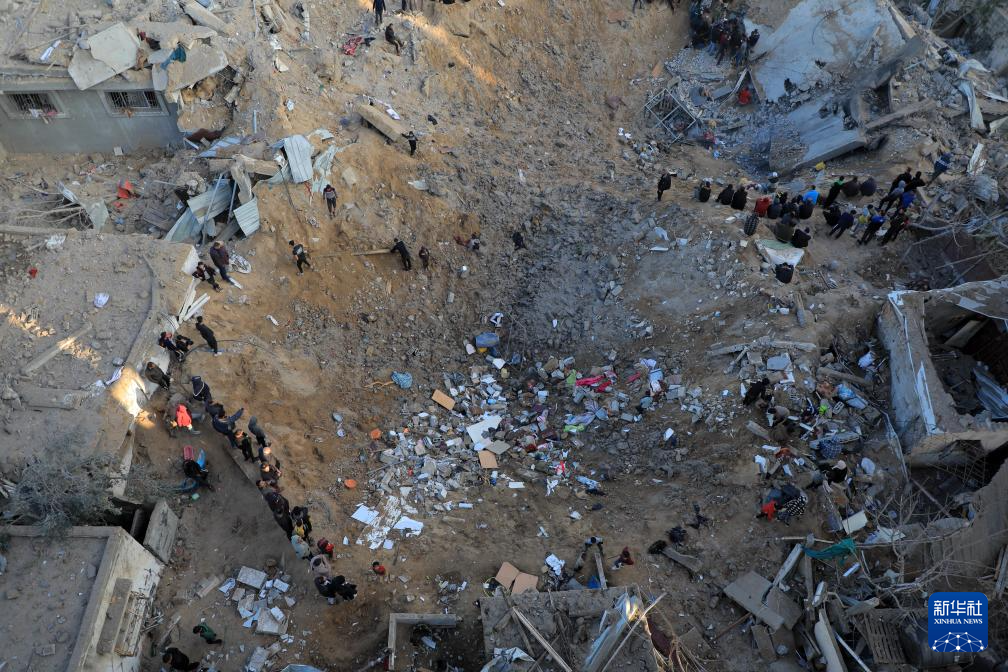 2月20日,在加沙地带中部努赛赖特难民营,巴勒斯坦人查看以军空袭后的损毁情况。