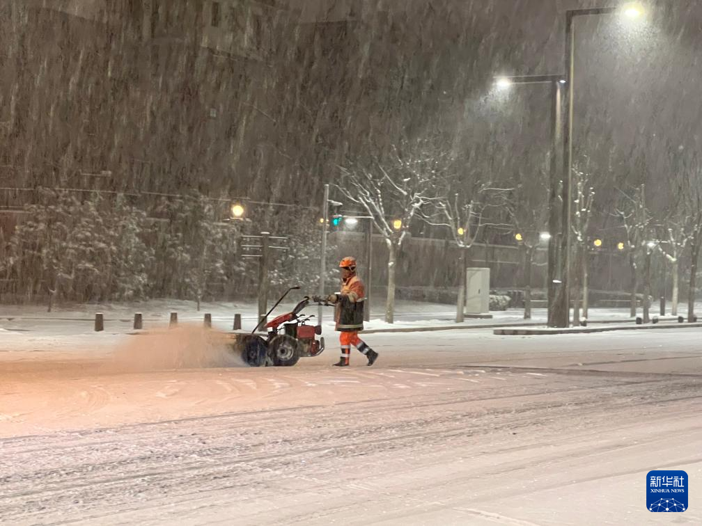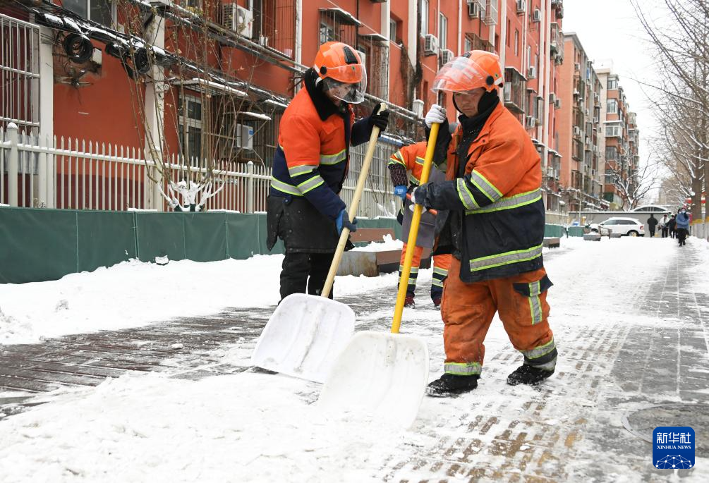 2月20日,北京迎来降雪,北京市海淀区各街镇通过使用扫雪设备、撒融雪剂、人工扫雪等方式清除道路积雪,保障市民出行畅通。