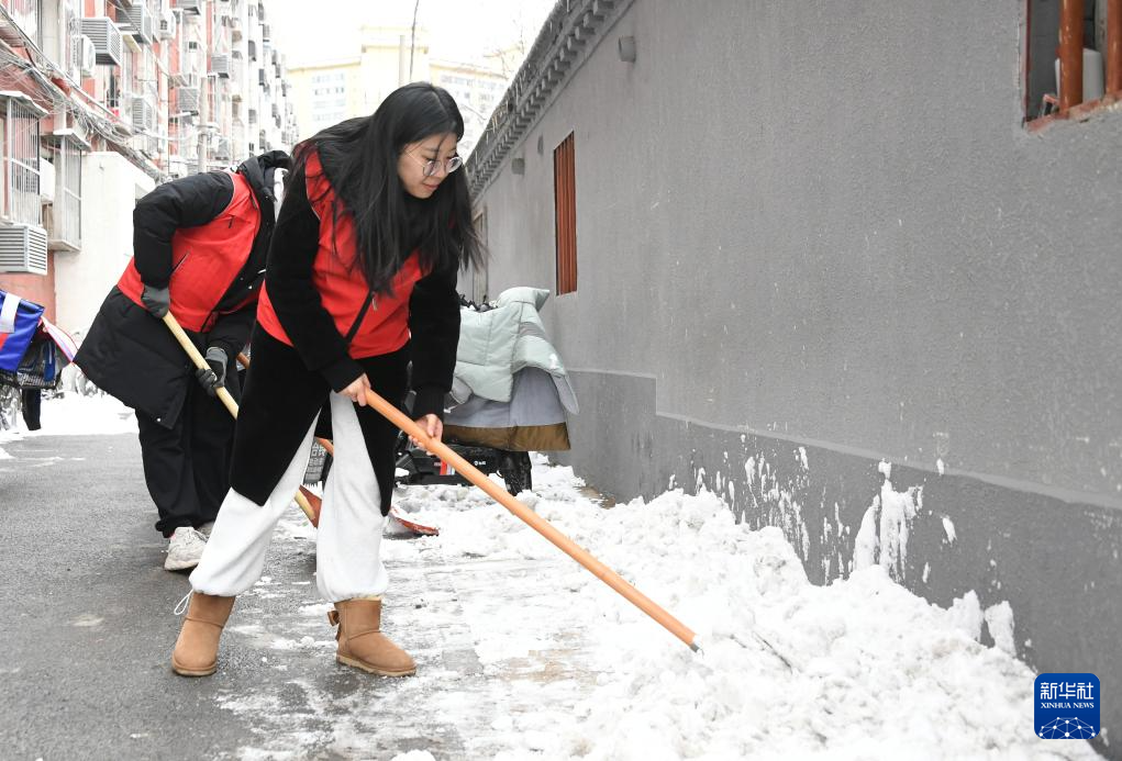 2月21日,北京市海淀区北太平庄街道志愿者在红联村社区除雪。