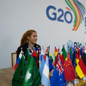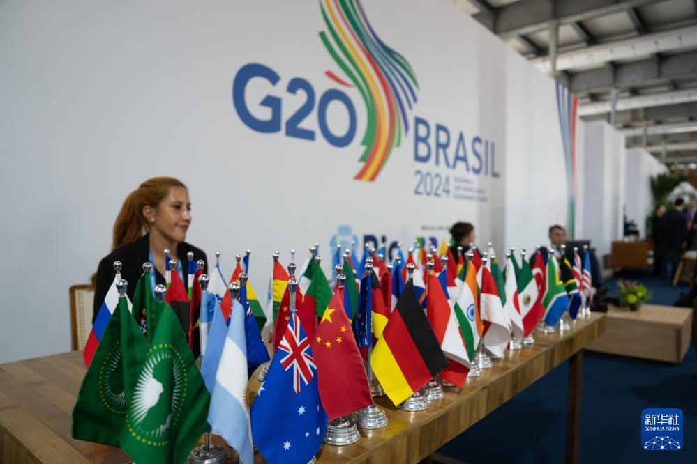这是2月21日在巴西里约热内卢举行的二十国集团外长会议会场中拍摄的旗帜。