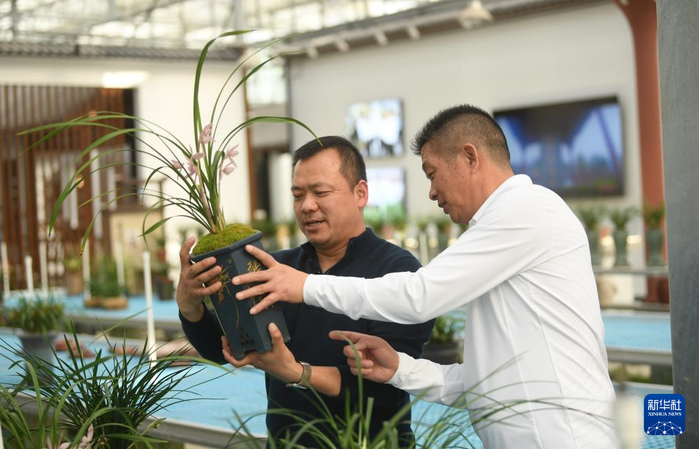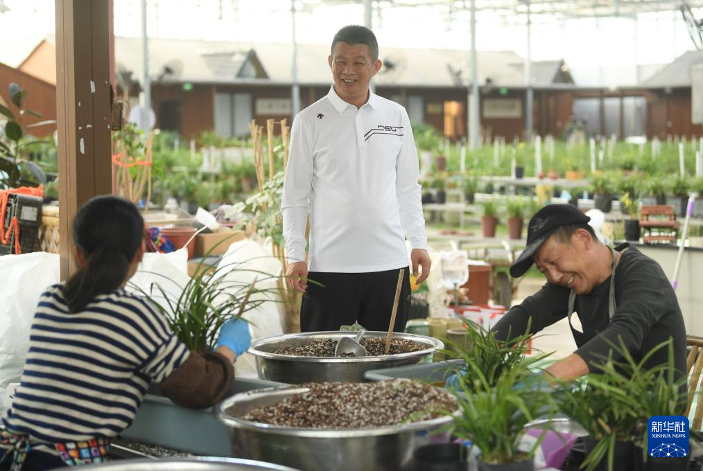 刘建明(中)在村里一家兰花种植基地走访,了解花农的诉求(2月19日摄)。