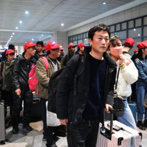 2月21日,来自甘肃省定西市的务工人员搭乘专列抵达福州后排队出站。
