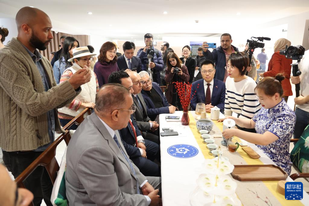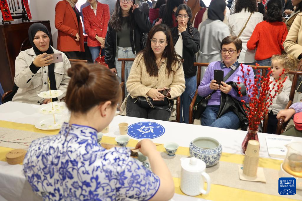 2月21日,人们在摩洛哥拉巴特举办的“江西风景独好”活动上欣赏茶艺表演。