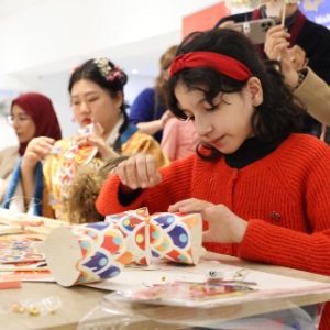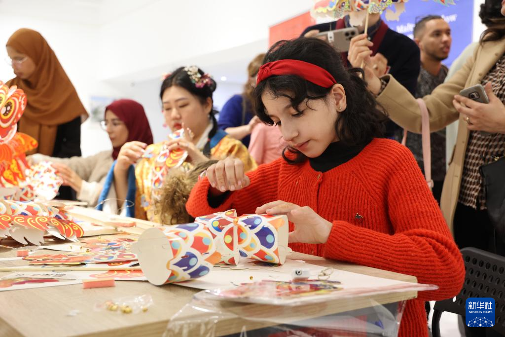 2月21日,人们在摩洛哥拉巴特举办的“江西风景独好”活动上体验鲤鱼灯制作。