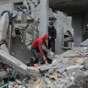 2月22日,在加沙地带南部城市拉法,巴勒斯坦人查看以军空袭后的废墟。