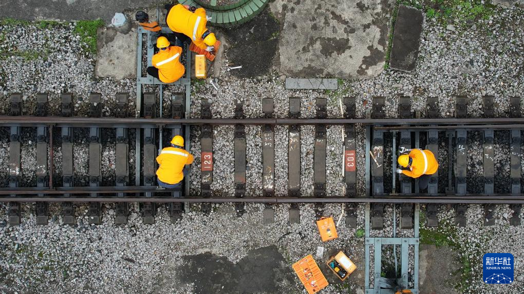 2月22日,林向阳和同事们在桂林机务段货场按分工检查调试无联锁道岔(无人机照片)。