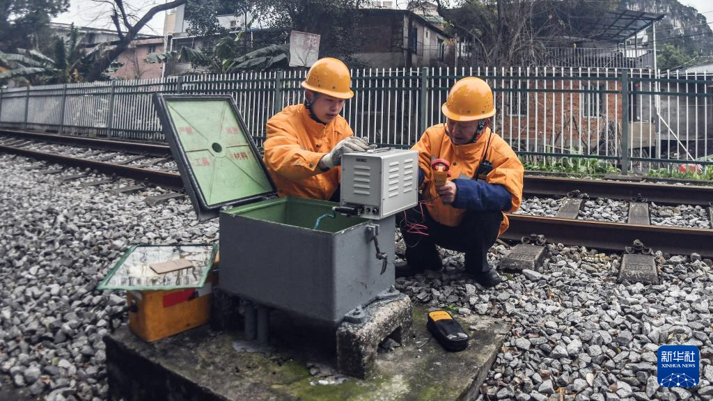 2月22日,林向阳(右)带领徒弟在对桂林市南溪山道口信号设备进行检修维护。