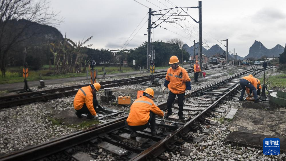 2月22日,林向阳(左三)在桂林机务段货场组织同事调试无联锁道岔。