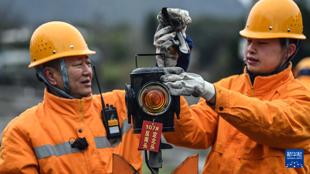 2月22日,林向阳(左)和徒弟检修桂林机务段货场中的道岔表示灯。