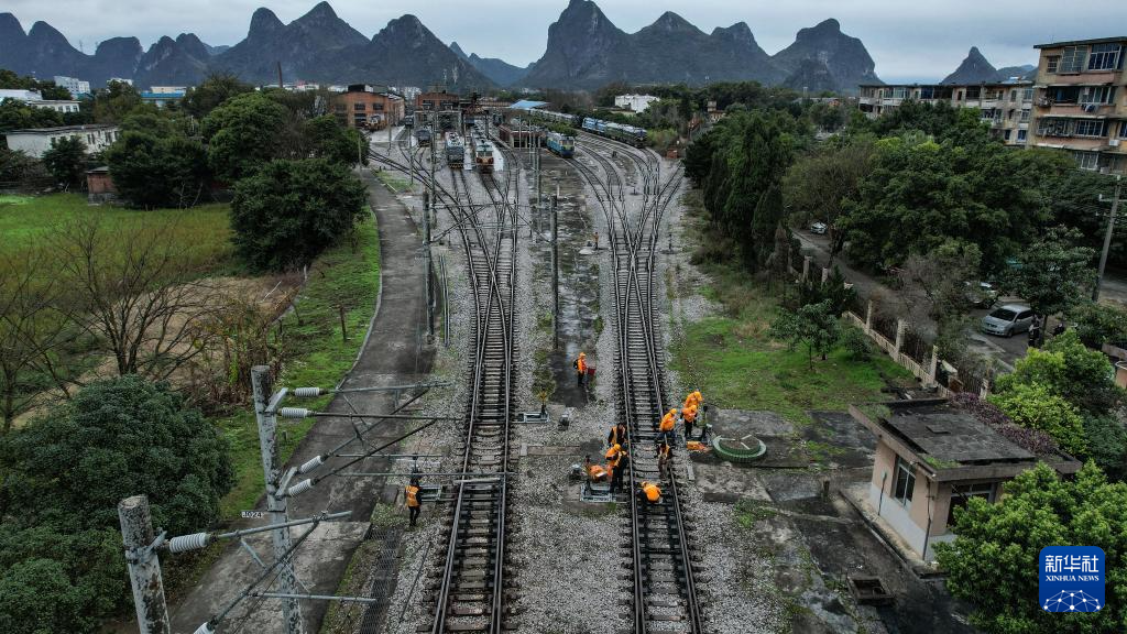2月22日,林向阳和同事们在桂林机务段货场对无联锁道岔进行集中整修(无人机照片)。