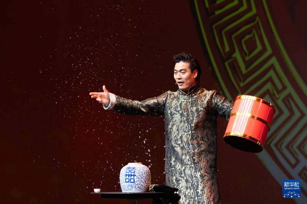 2月22日,演员胡玲珑在荷兰阿姆斯特丹举行的“四海同春”慰侨访演活动上表演古彩戏法。