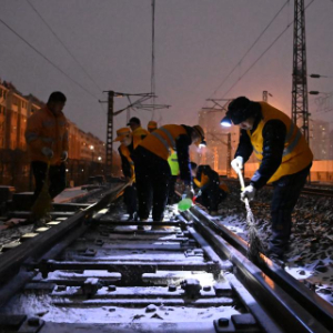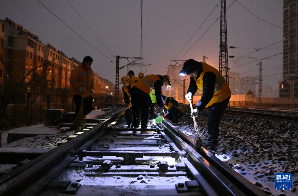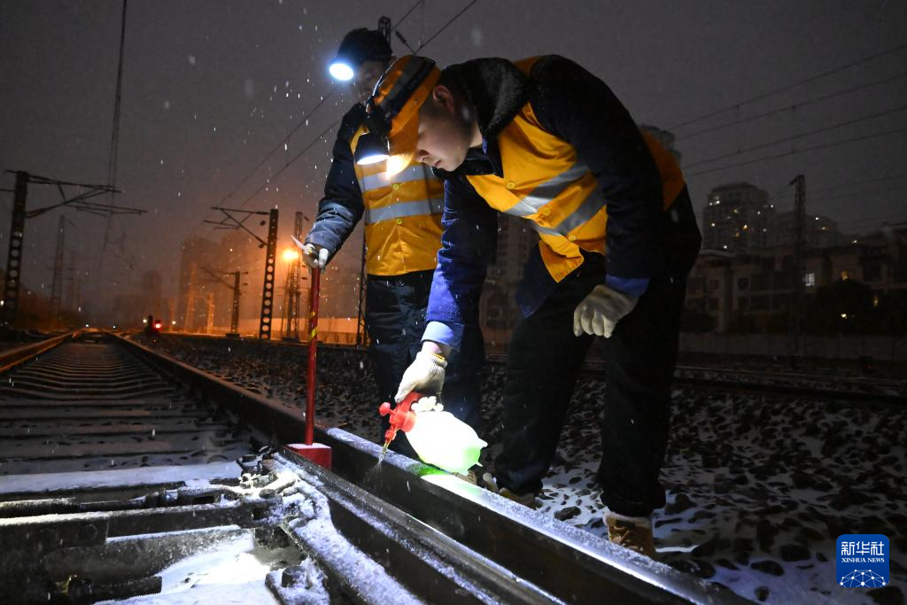 2月22日,中国铁路上海局集团有限公司淮南西站管内大通站组织职工对线路道岔喷洒防冻液,保障电煤运输线路畅通。