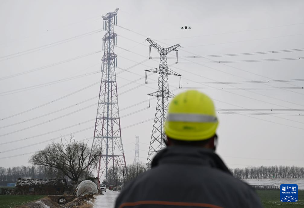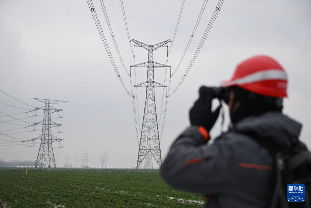 2月22日,在淮南市大通区,安徽送变电工程有限公司运检分公司淮南运检站工作人员查看输电线路下方情况,防止异物影响输电线路安全。