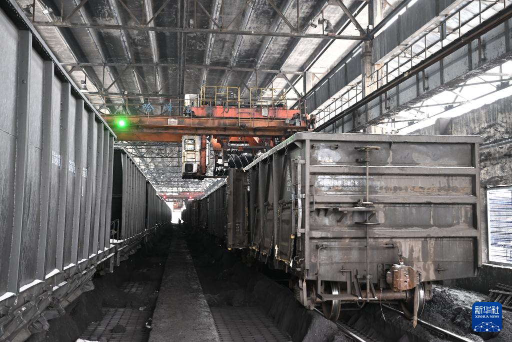 2月22日,在淮南市洛河发电厂,螺旋卸煤机在进行卸煤作业。