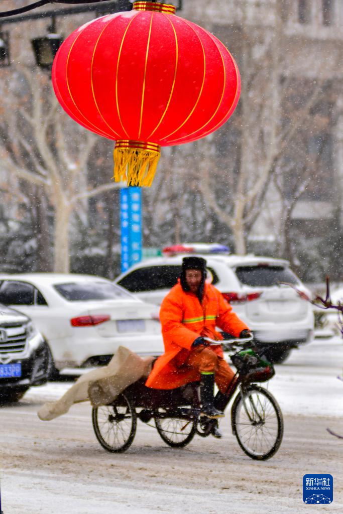 2月21日,一名环卫工人冒雪骑行在山东省青州市街头。