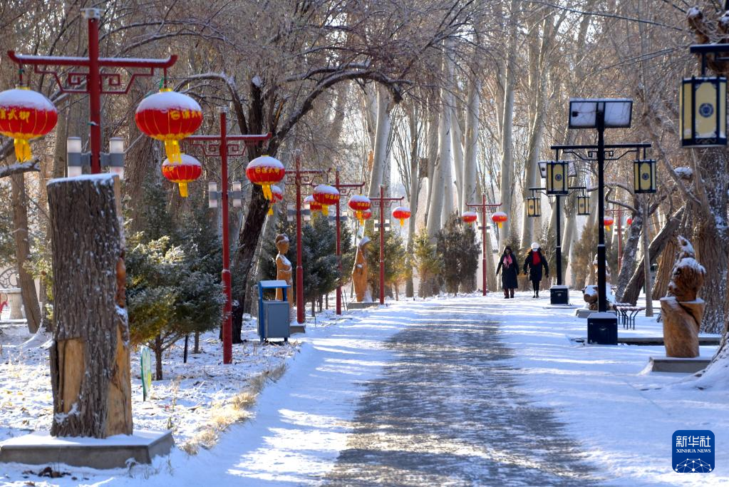 2月21日在甘肃省酒泉市肃州区一座公园里拍摄的雪后景色。
