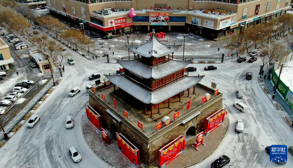 2月21日在甘肃省酒泉市拍摄的雪后钟鼓楼(无人机照片)。