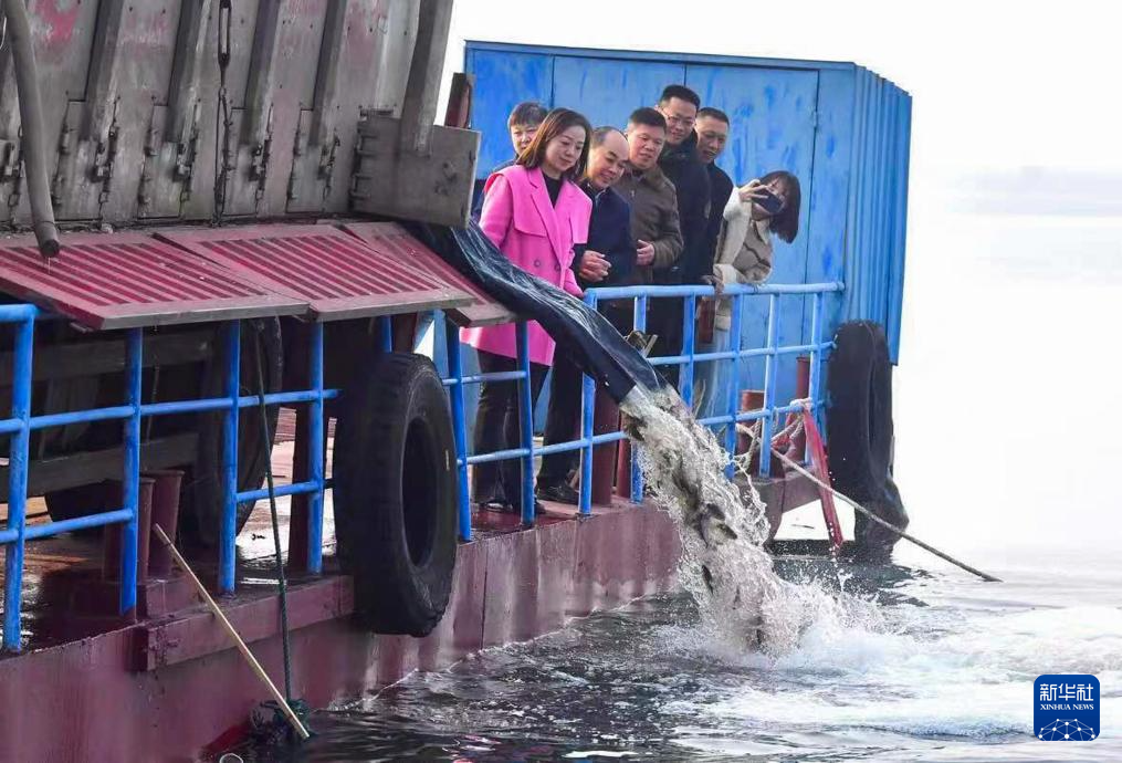王琼(左一)与来自武汉市农业农村局、武汉市禁捕办以及武汉养殖企业的相关人员一同来到位于湖北省石首市的天鹅洲白鱀豚国家级自然保护区,为长江江豚送来“过冬口粮”(2023年12月28日摄)。