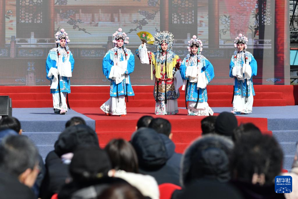 2月23日,山东省青岛市萝卜·元宵·糖球会海云庵会场开街纳客,市民在活动现场欣赏京剧表演。