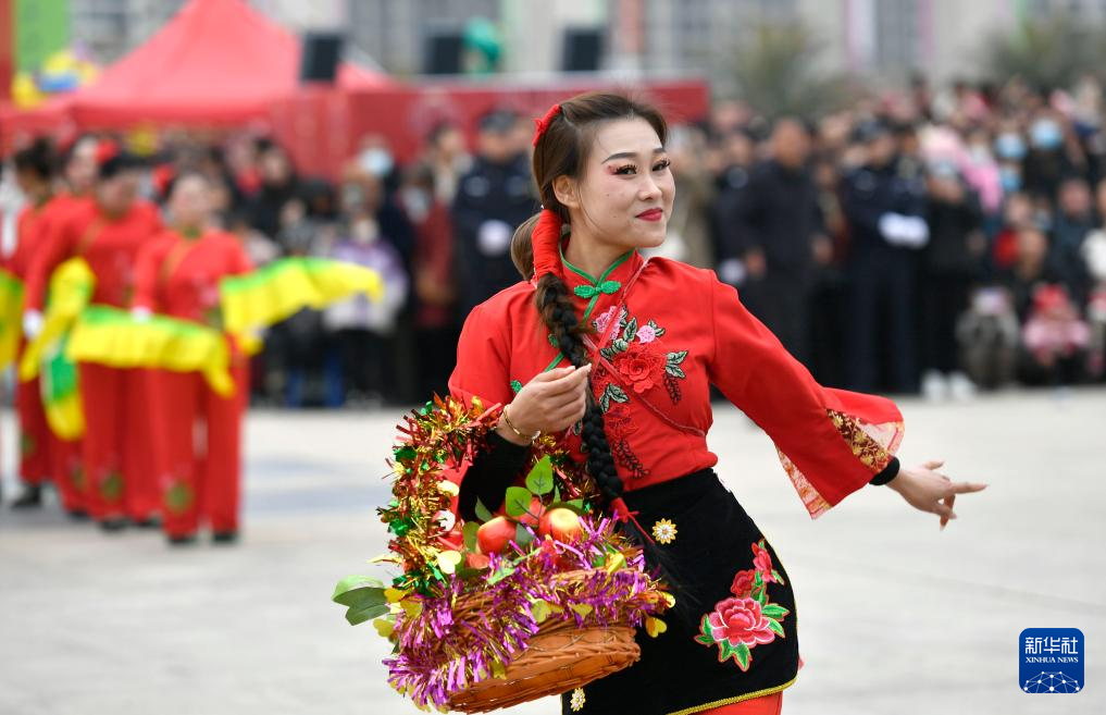 2月22日,在甘肃省陇南市市政广场,社火队演员在表演“回娘家”。