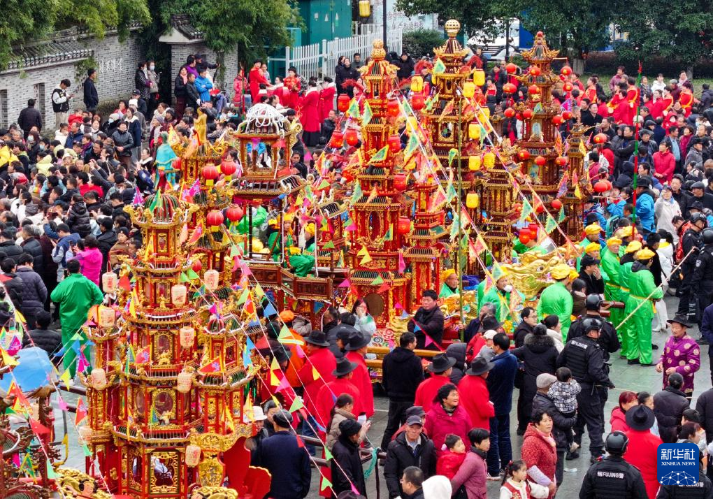 2月23日,浙江省宁波市宁海县前童镇举行抬阁民俗活动(无人机照片)。