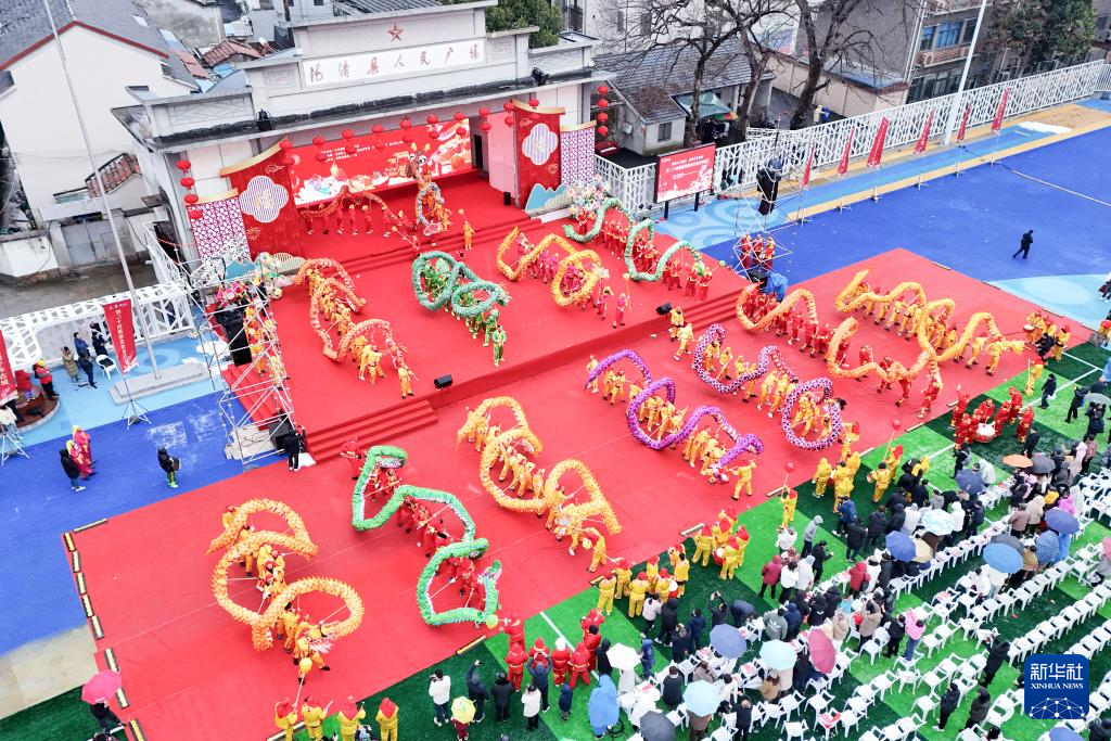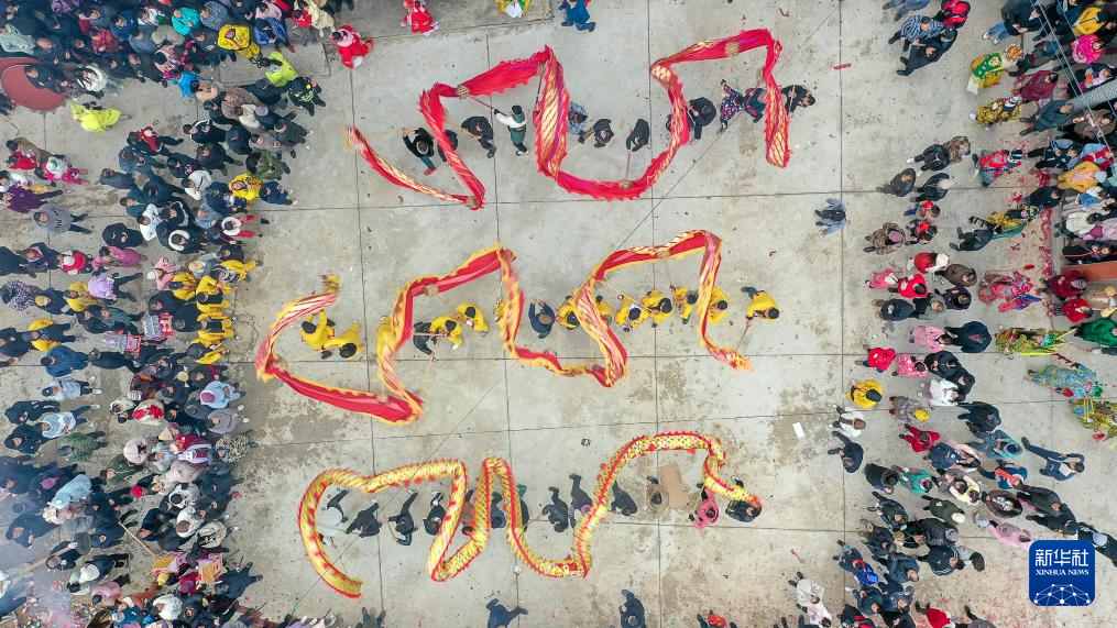 2月23日,村民在湖南省衡阳县三湖镇毫冲村表演舞龙(无人机照片)。