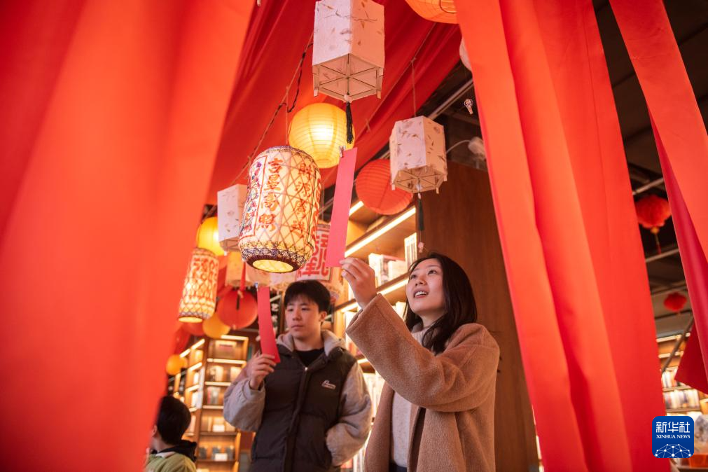 2月23日,在湖南省娄底市娄星区三向度书屋,市民在猜灯谜。